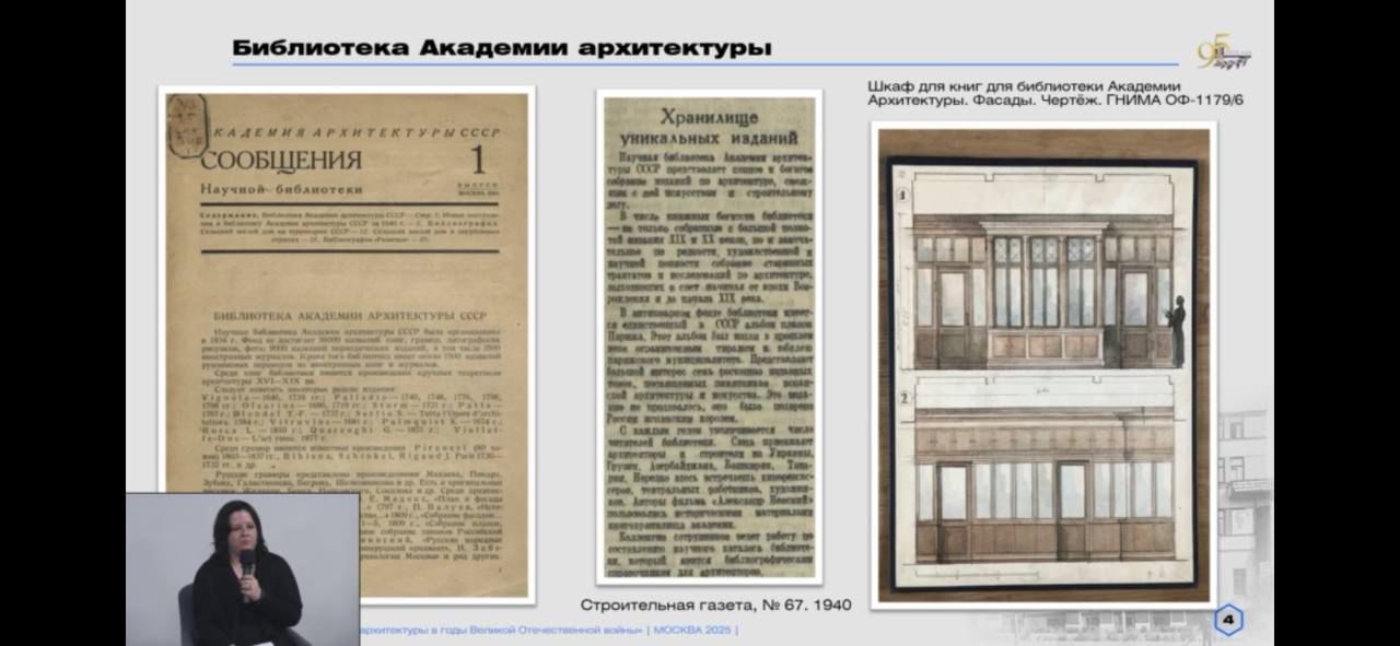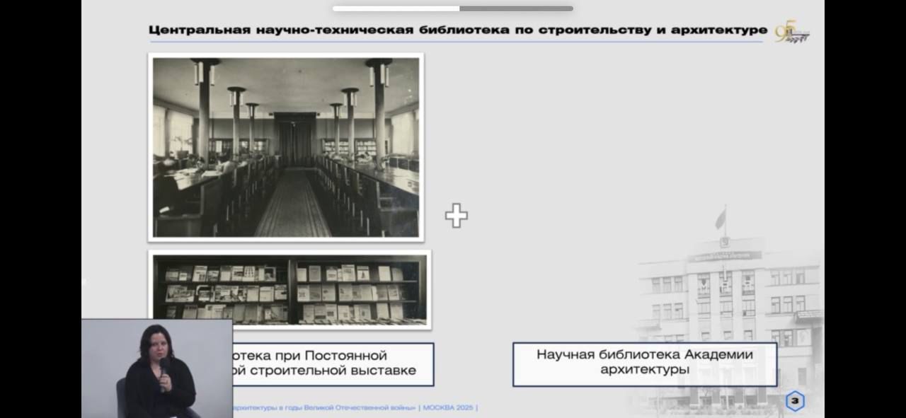 Ирина Храпова, главный библиограф отдела научно-библиографической работы ЦНТБ СиА, представила уникальный материал о работе Научной библиотеки Академии архитектуры в годы войны.