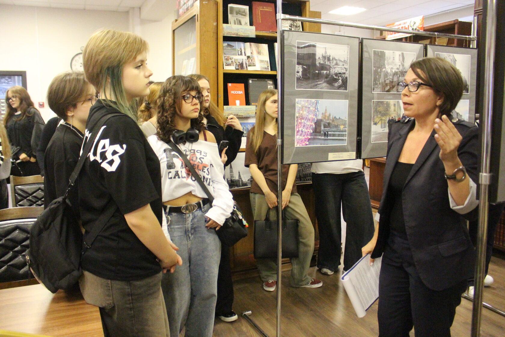 Программу начали со знакомства с библиотекой, обучения ребят работе с картотекой и электронным каталогом, рассказали о выставке «Два мгновения — один взгляд. Москва в кинокадрах фронтовых кинооператоров и Москва современная». Студенты с удивлением сравнивали Москву военного времени с современной столицей. Фронтовые кинокадры демонстрировали суровую реальность, а современные снимки — возрожденную и процветающую жизнь. Этот контраст помог им почувствовать связь времён и осознать значение истории.